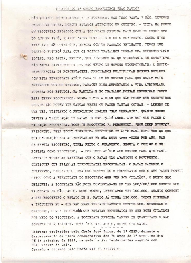 Discurso feito pelo Chefe José Spina durante o descerramento da placa comemorativa dos 70 anos dos 1° GESP no dia 26 de Setembro de 1993. Gravado e copiado pelo Chefe Manuel Fernando. |