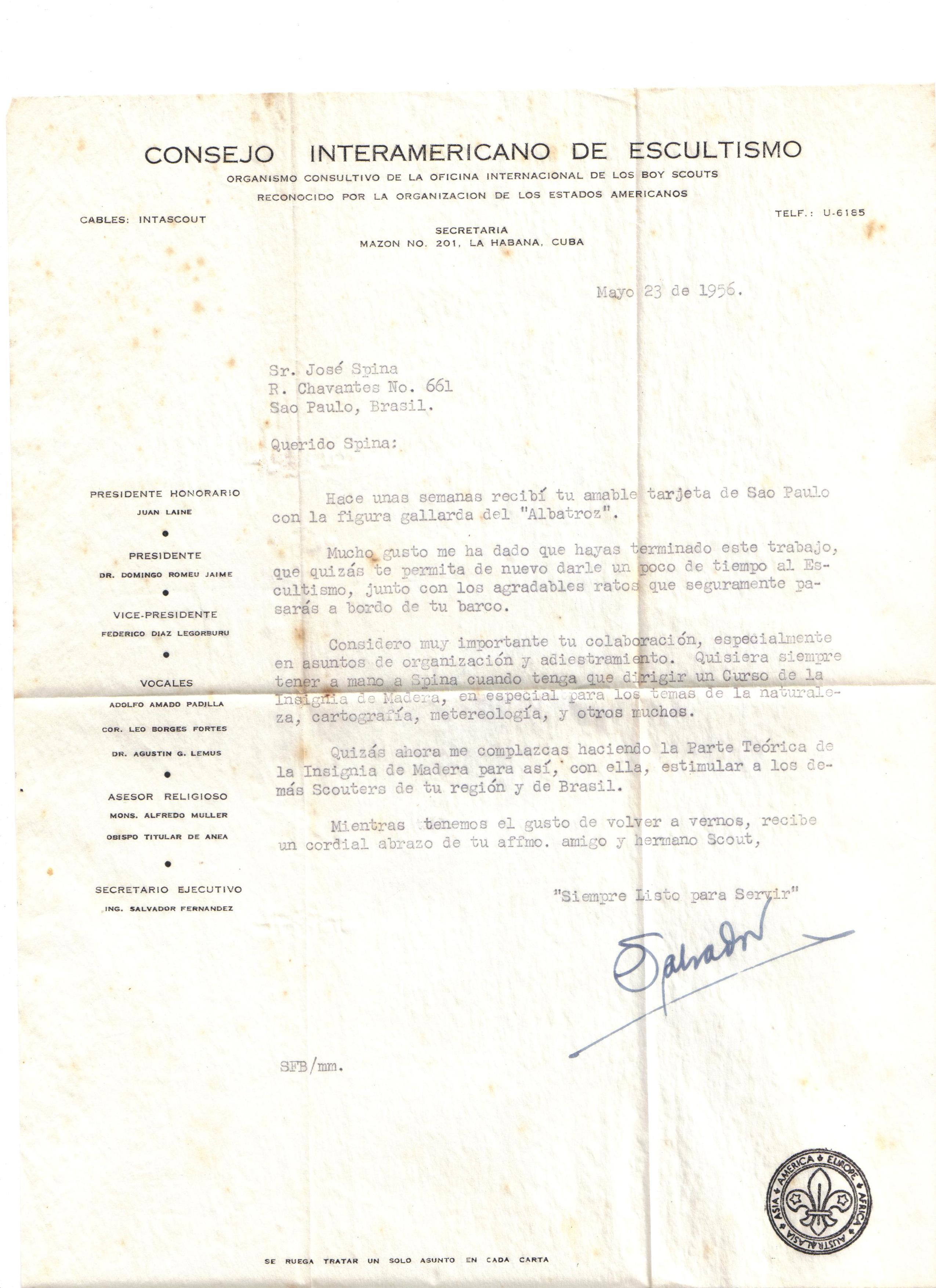 Correspondência enviada pelo Secretário Executivo do Conselho Interamericano de Escotismo Salvador Fernandez em 1956 ao Chefe José Spina. |