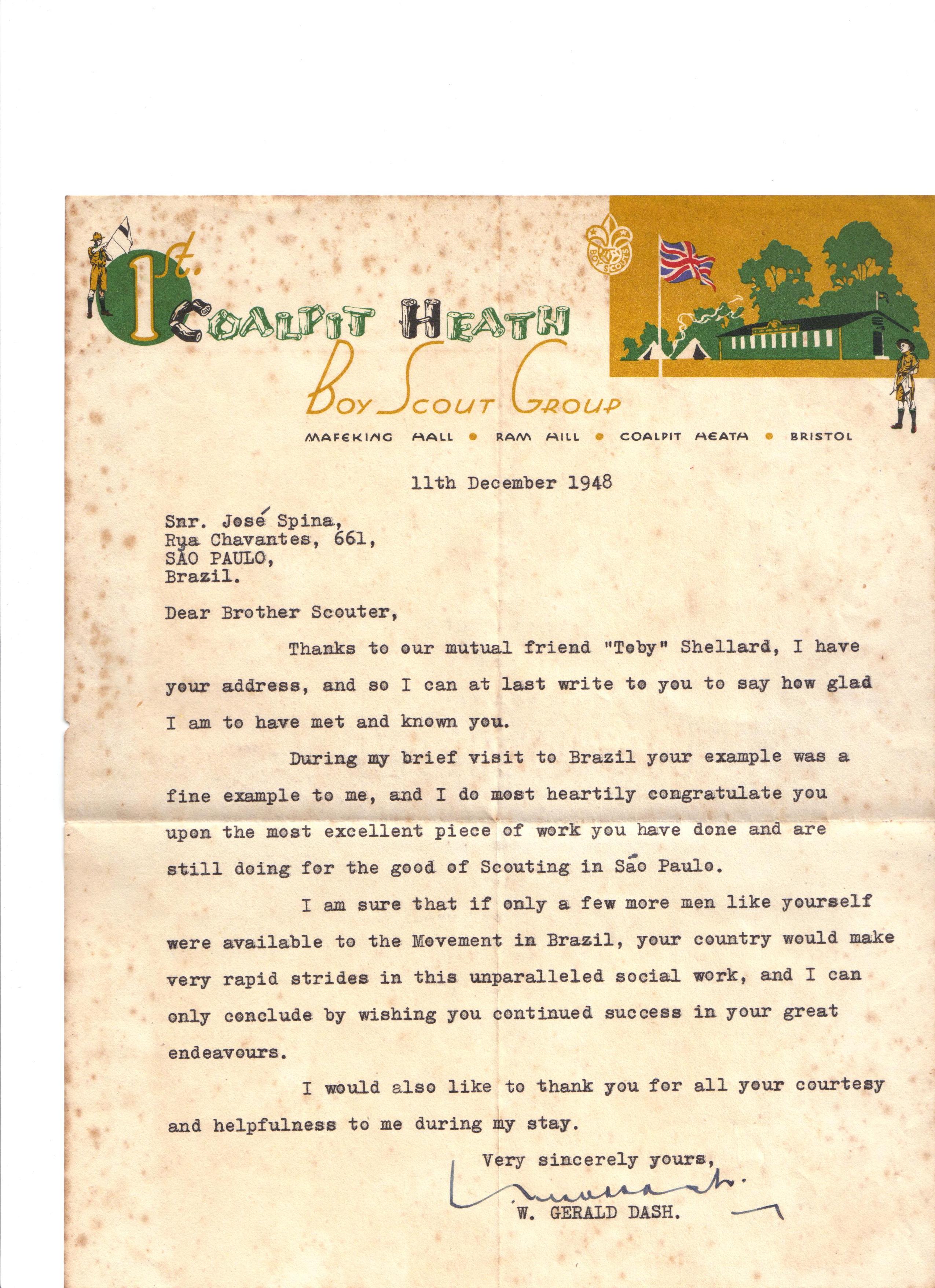 Correspondência enviada por W. Gerald Dash do 1st. Coalpit Heath Boy Scout Group da Inglaterra ao Chefe José Spina. |