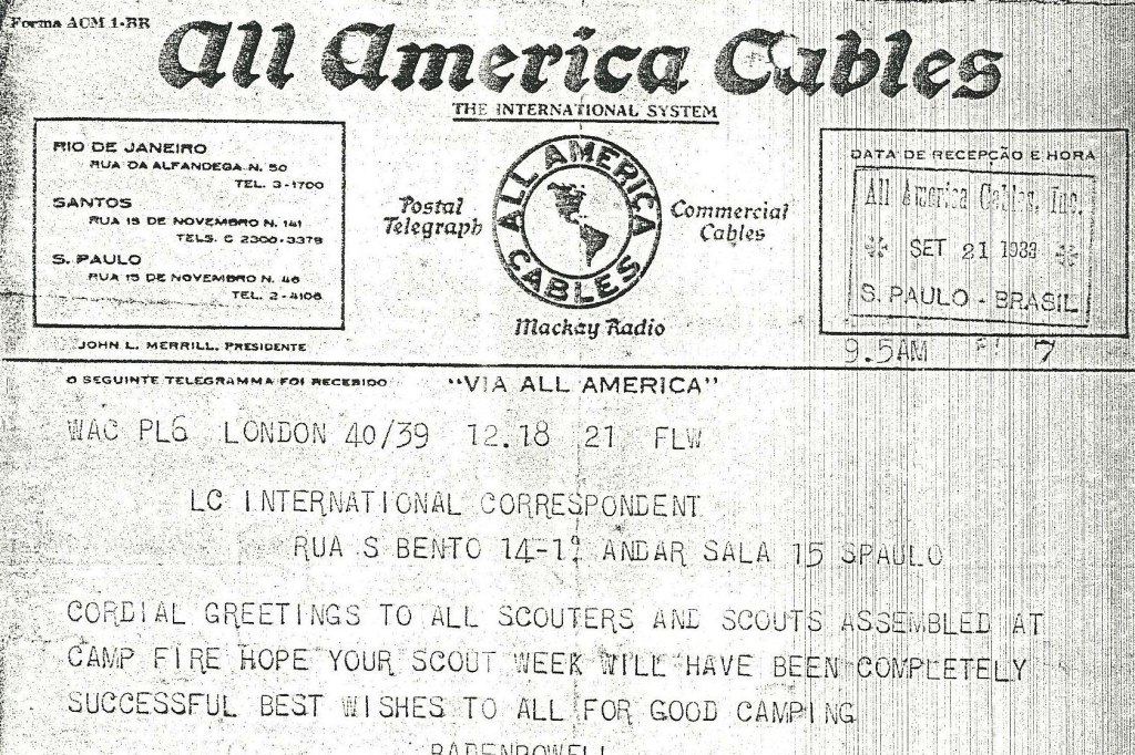 Telegrama enviado por Baden Powell para os Boy Scout Paulistas em 1933 quando da comemoração de nosso aniversário de 10 anos de fundação. |
