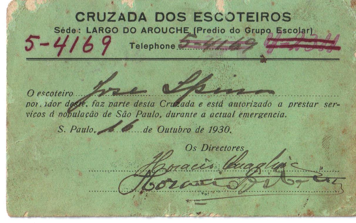 Cartão da Cruzada Escoteira utilizada por seus membros que atuaram no apoio a população durante a Revolução de 1930. |