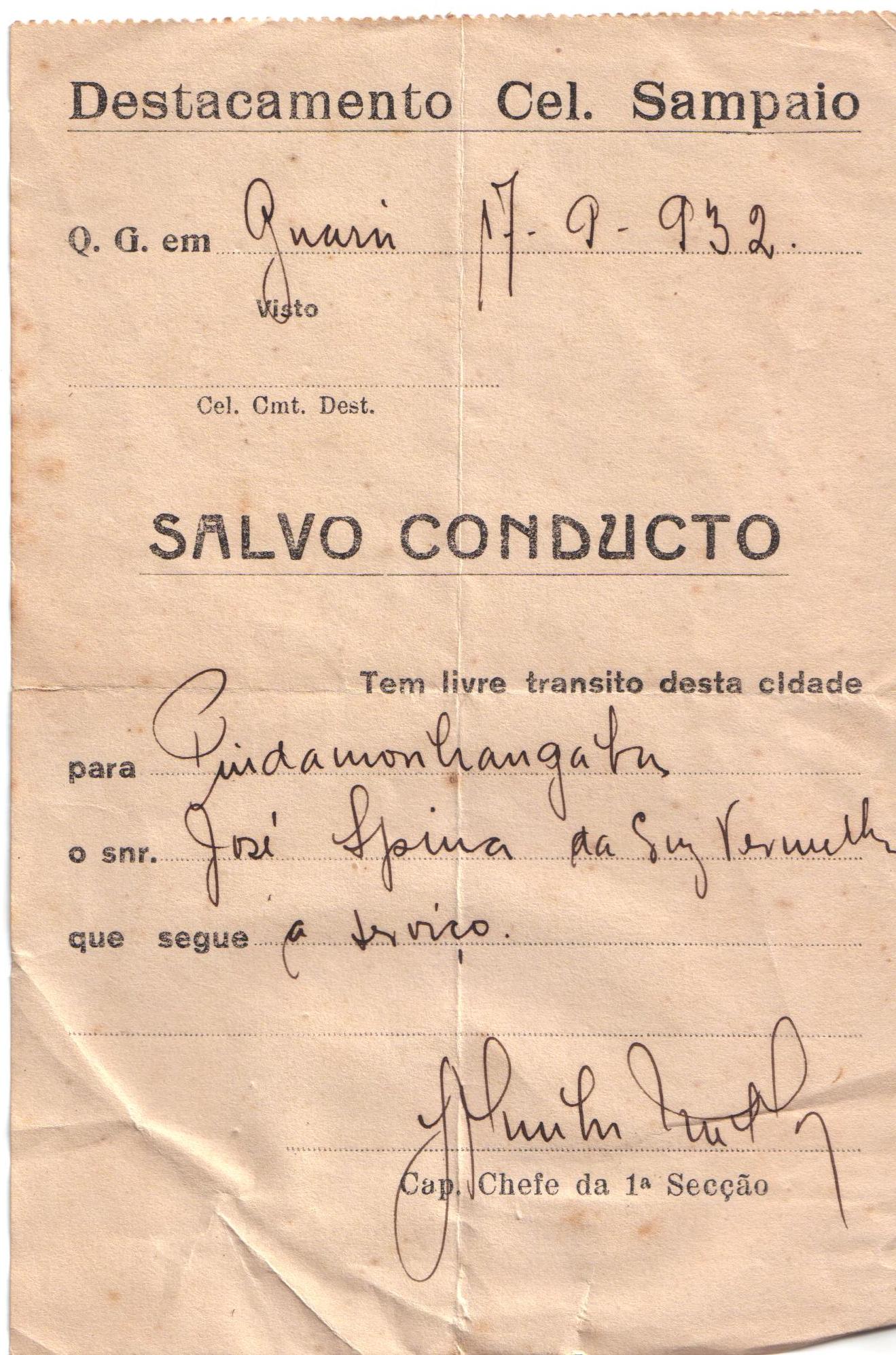 Salvo conducto de um Escoteiro a serviço da Cruz Vermelha emitido pelo Capitão Chefe da 1º Sessão de Pindamonhagada durante a Revolução Constitucionalista de 1932. |